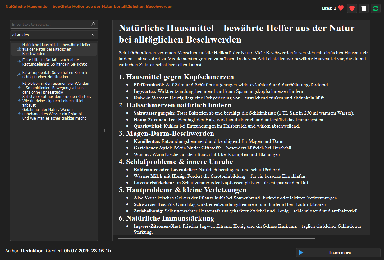 Über unseren News-Bereich erhalten Sie nützliche Informationen und aktuelle Nachrichten für den Katastrophenfall und weit darüber hinaus. Sie können Artikel offline herunterladen um auch ohne Internet-Verbindung darauf zugreifen zu können.